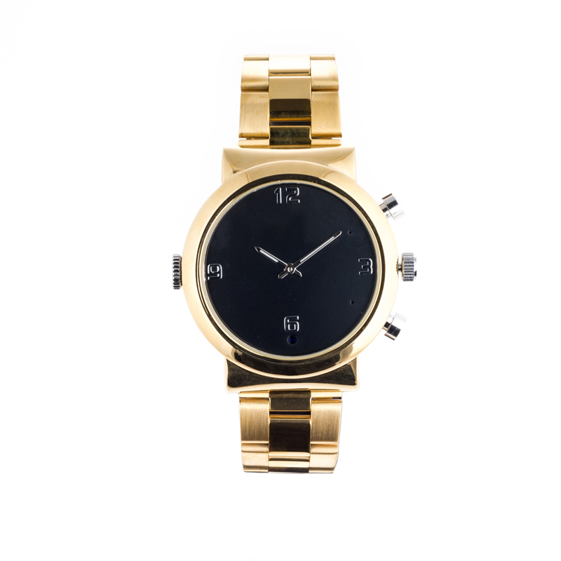 Reloj con cámara y micrófono de diseño elegante clásico para los que buscan un espía distinguido. Pulsera dorada en acero a juego de la caja y esfera negra. Para grabar vídeos con audio en Full HD.