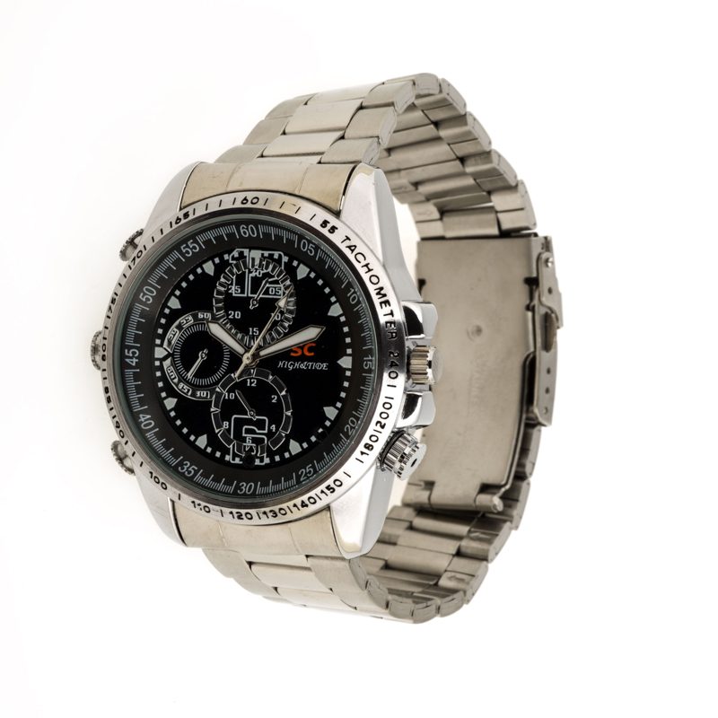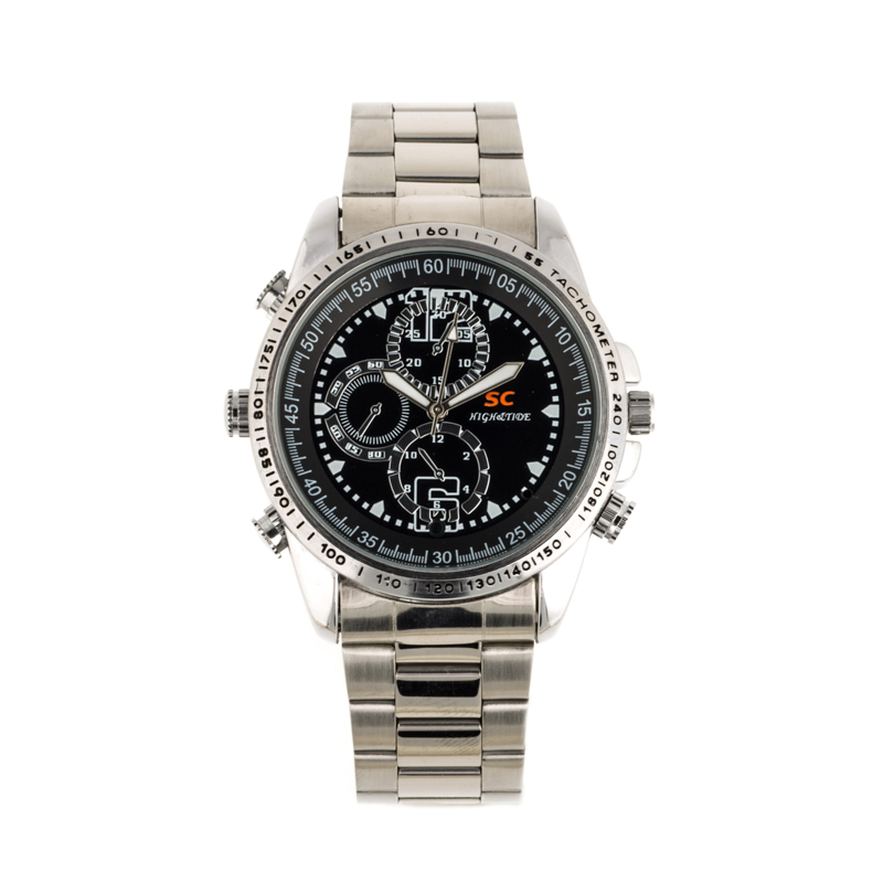 Reloj espía con cámara y micrófono ocultos con esfera en negro de estilo deportivo perfecto para los amantes de los deportes. Totalmente sumergible, hace fotos y graba vídeos con audio en 640 X 480.